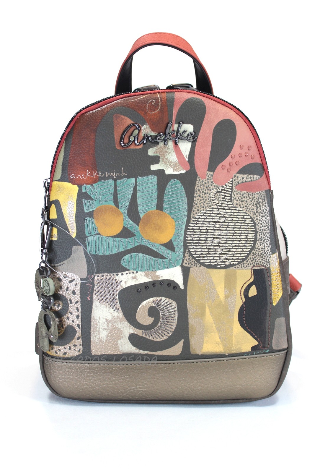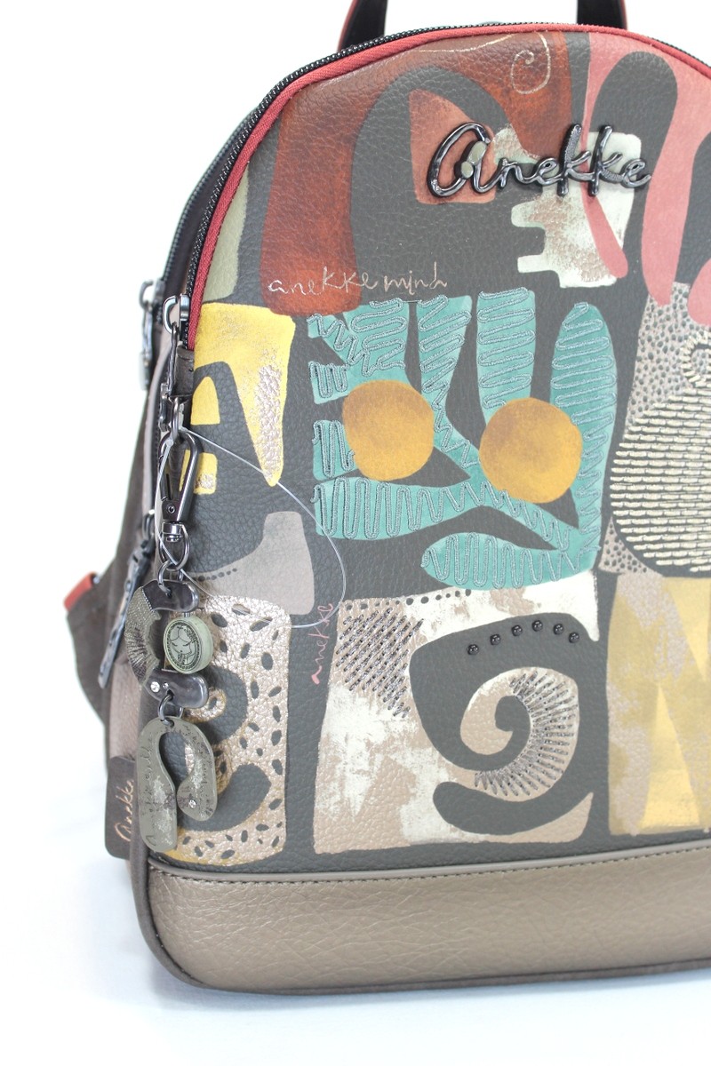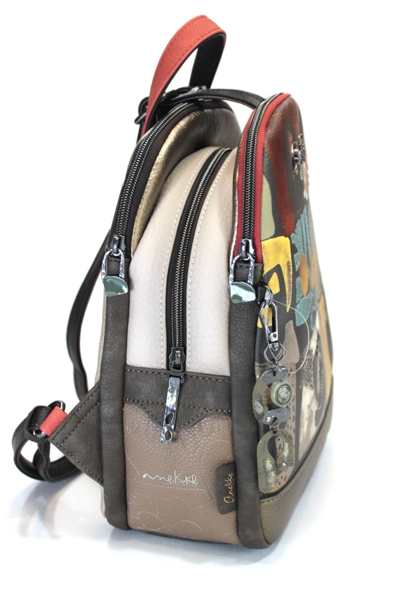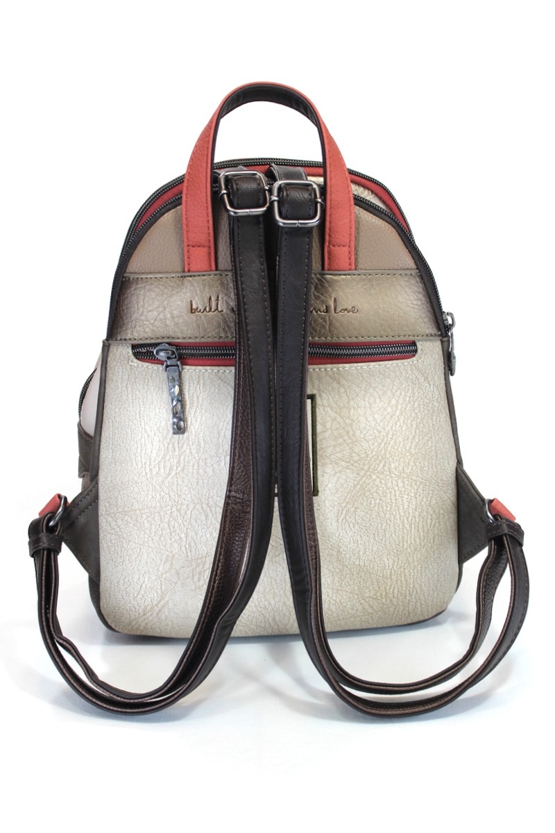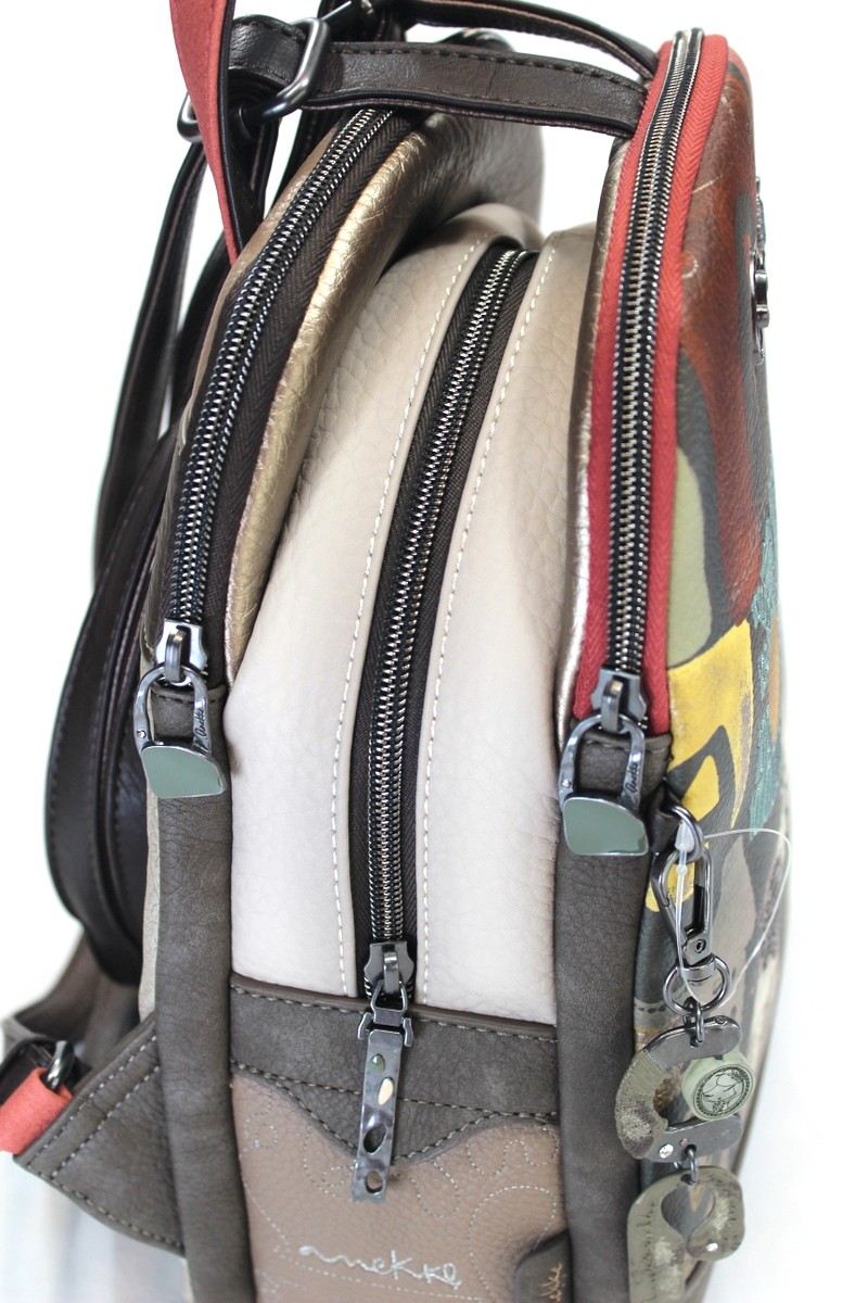 Mochila tamaño medio con tres compartimentos principales con cremallera.