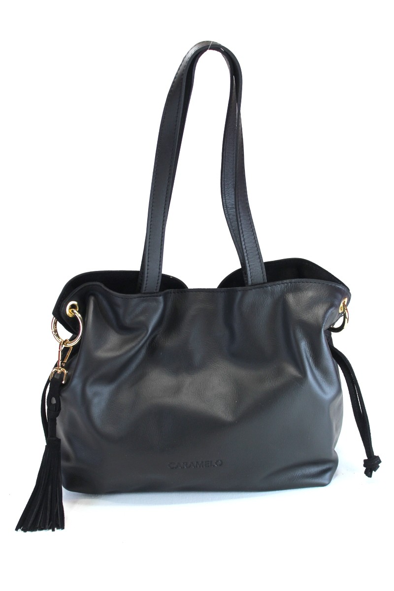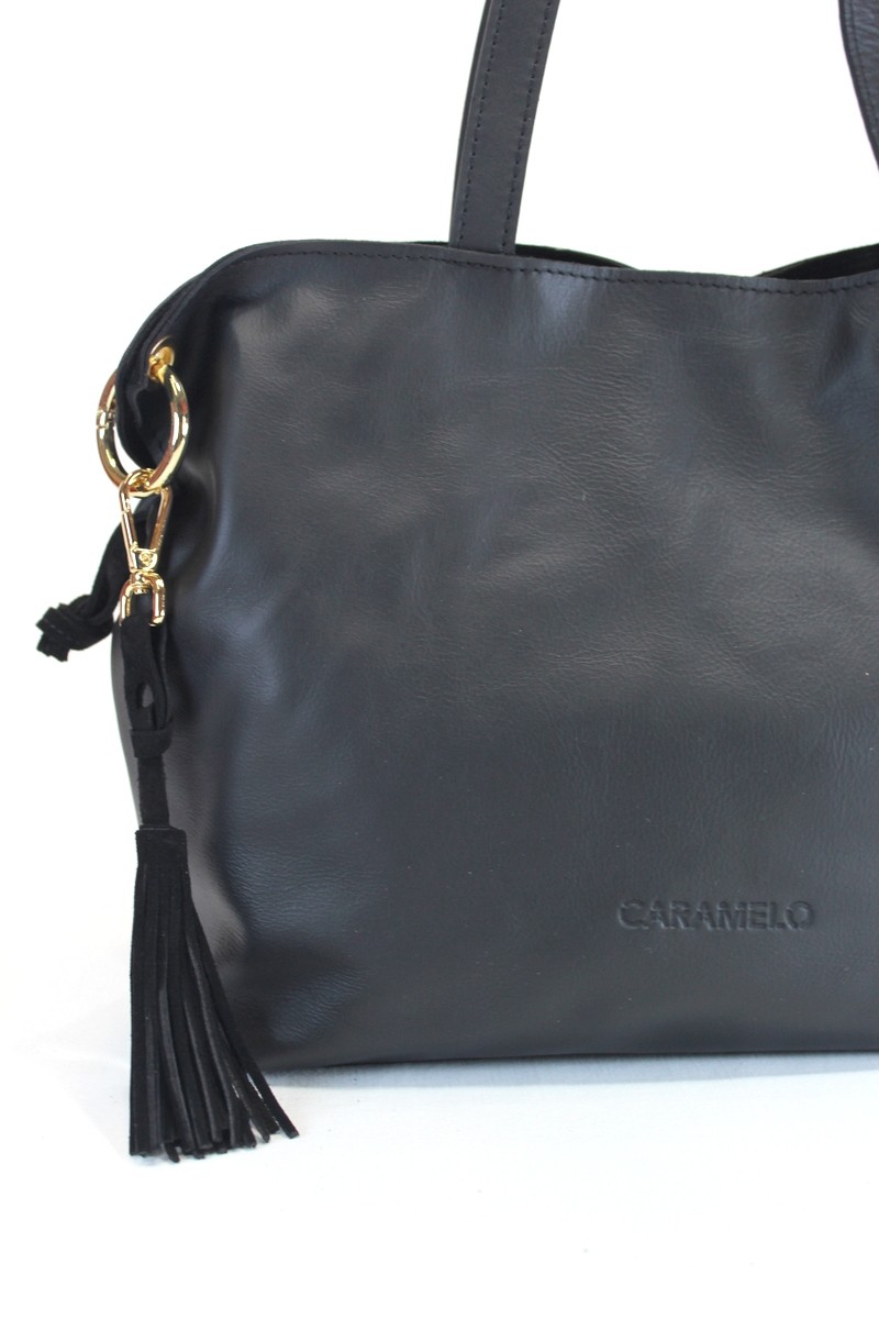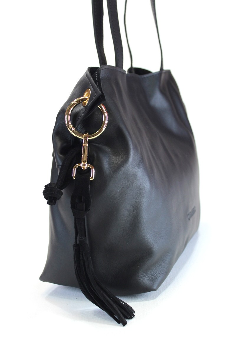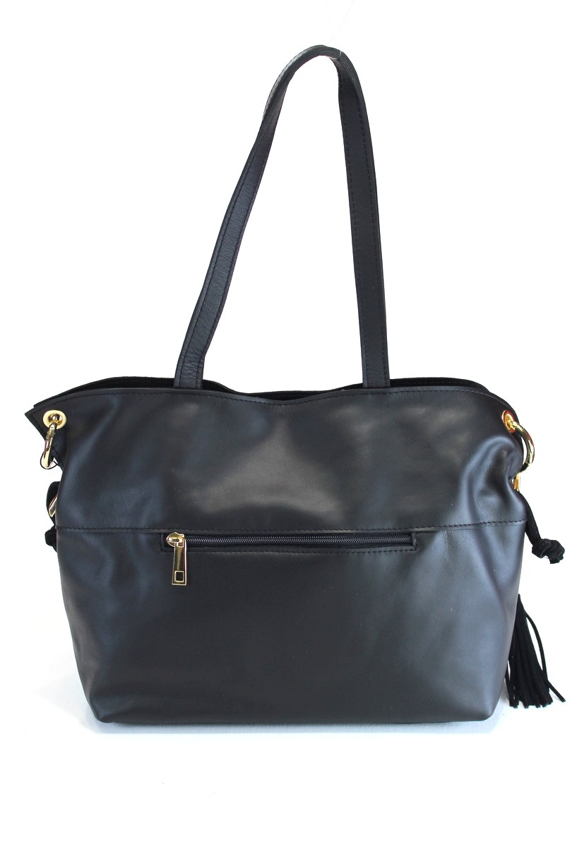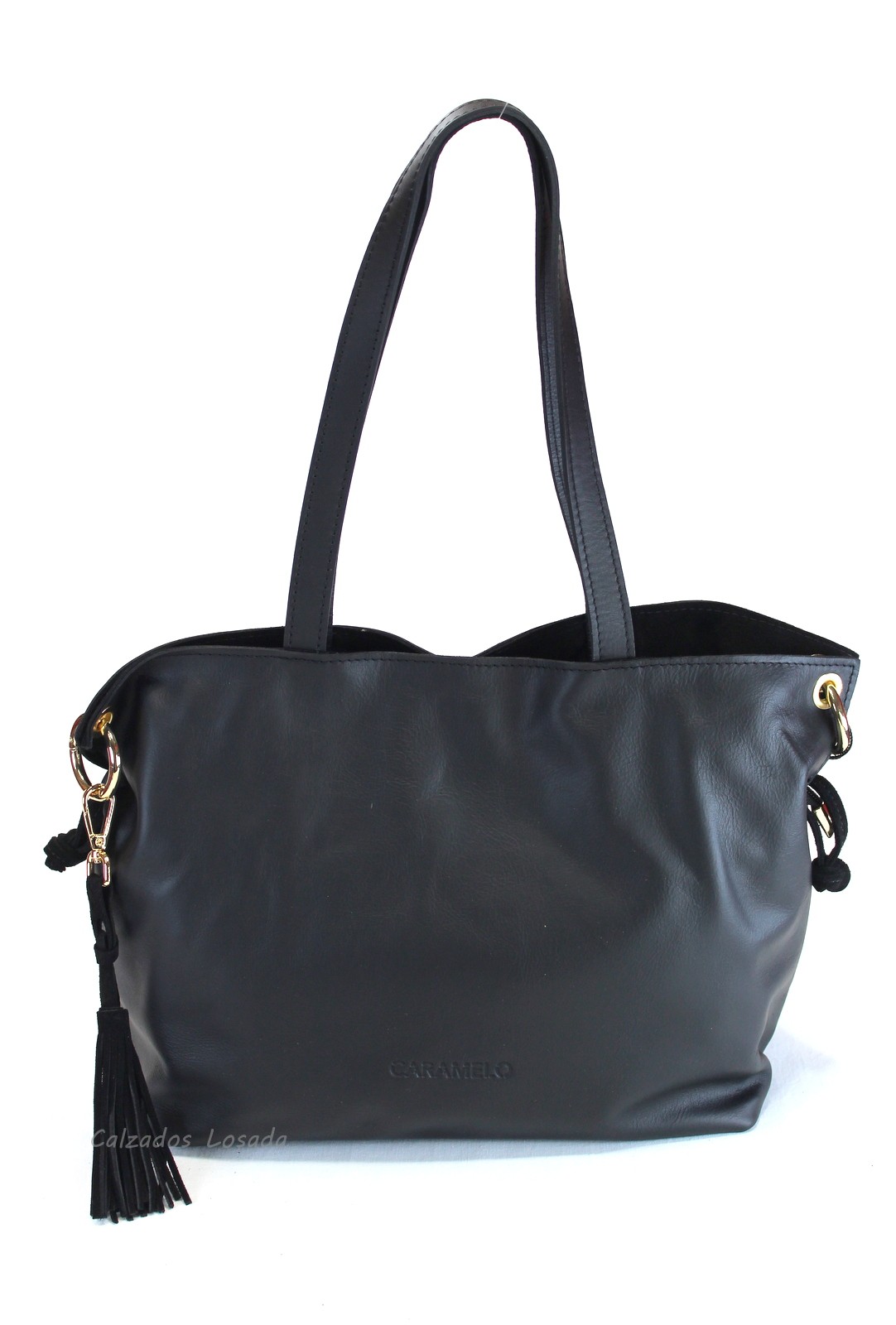 Materiales: Exterior y asas de piel suave, con un bolsillo de cremallera. Interior forrado de textil, con un bolsillo también de cremallera y otro sin cremallera.
