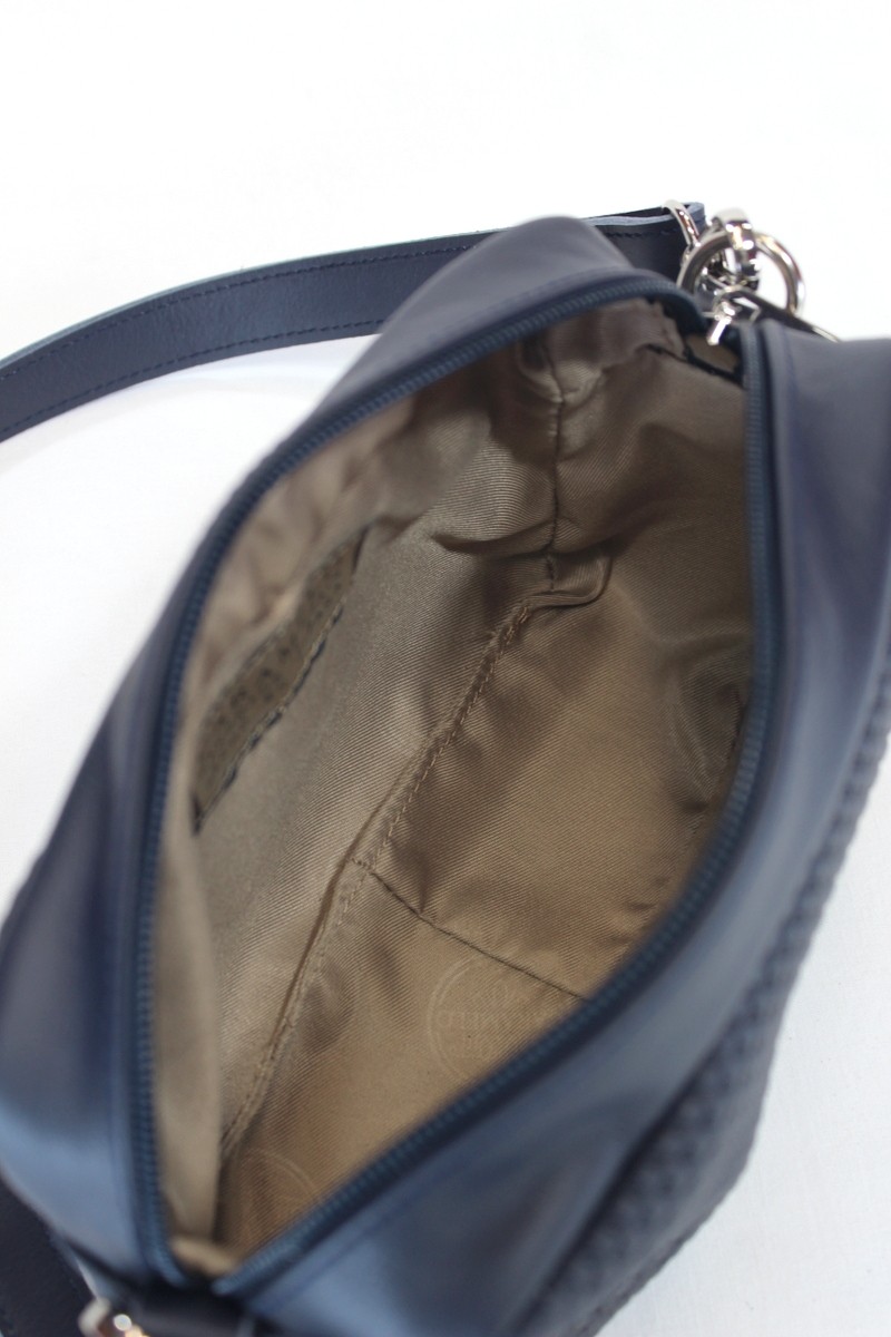 Materiales: Exterior, asa y bandolera de piel. Interior textil.
