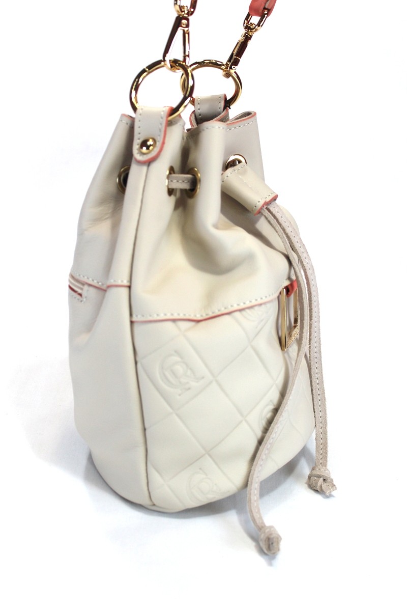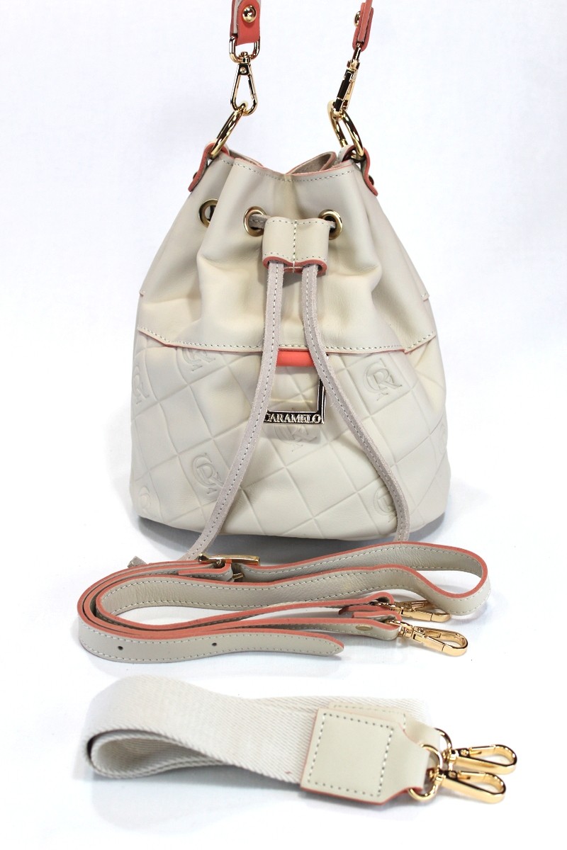 Bombonera pequeña con un asa de hombro de piel y otra de algodón, además