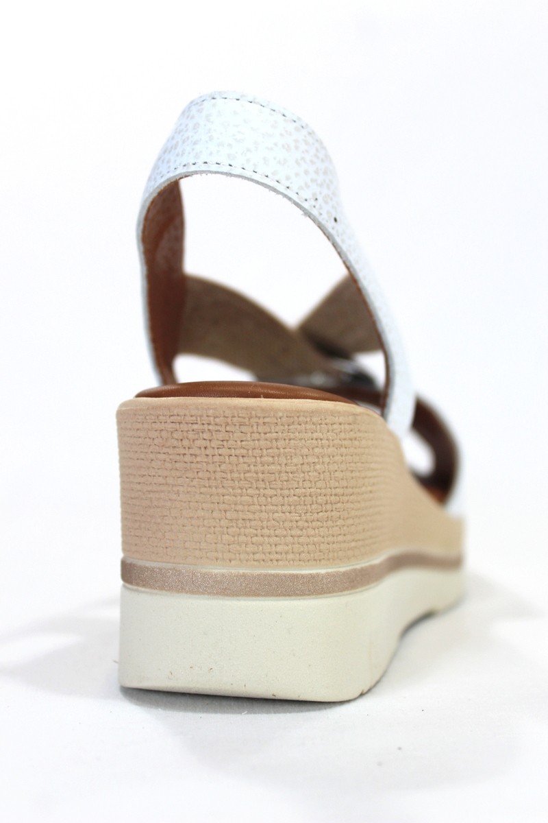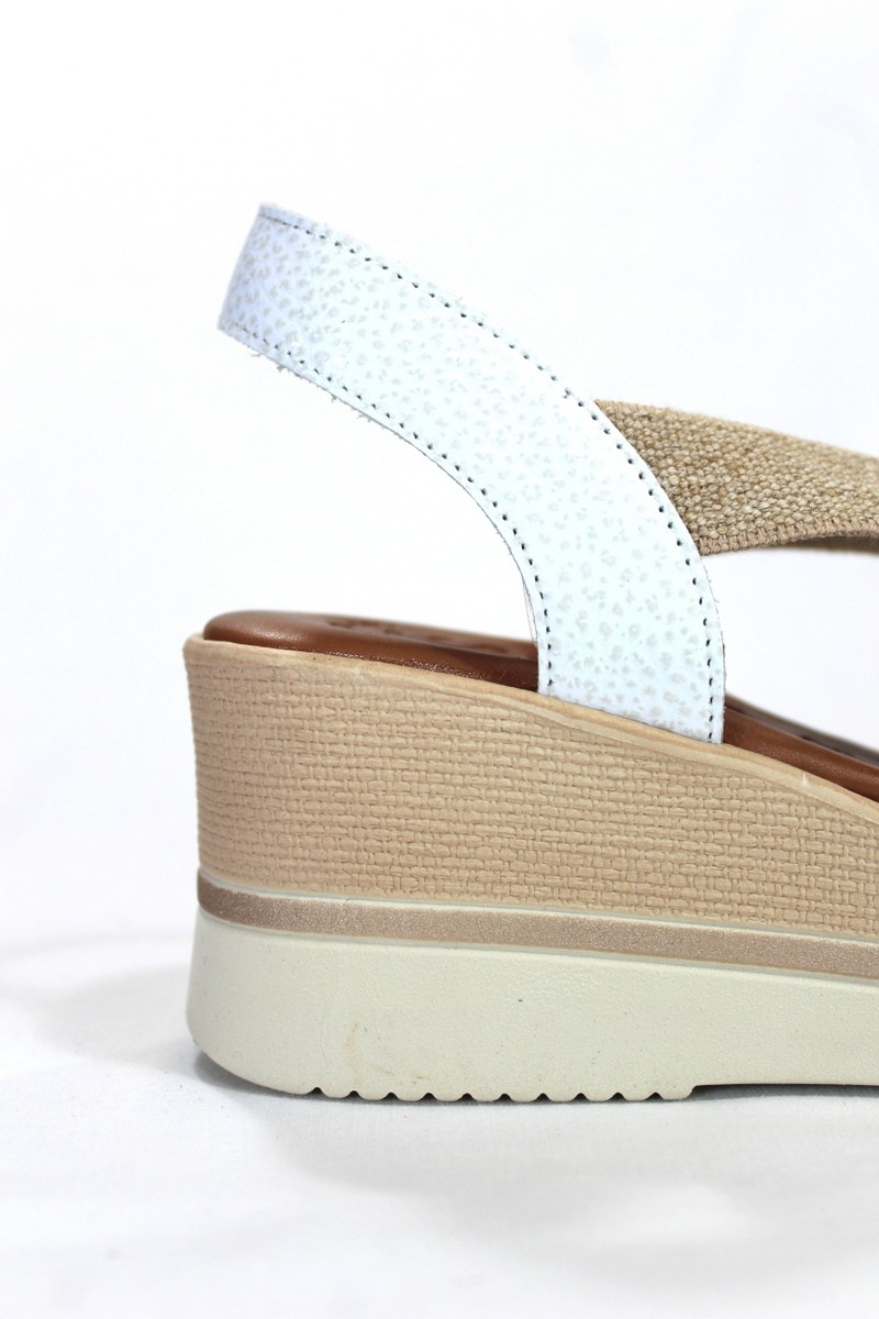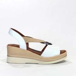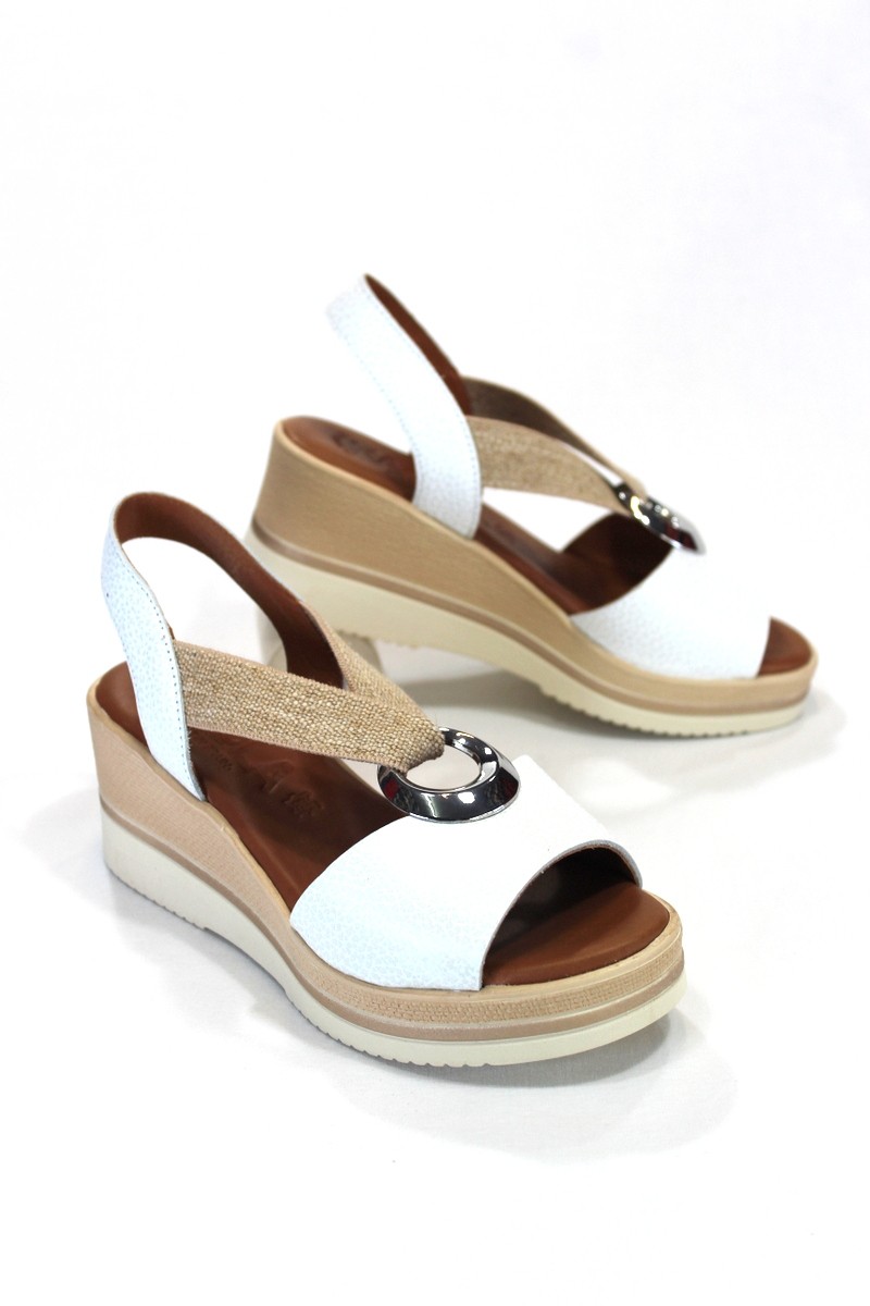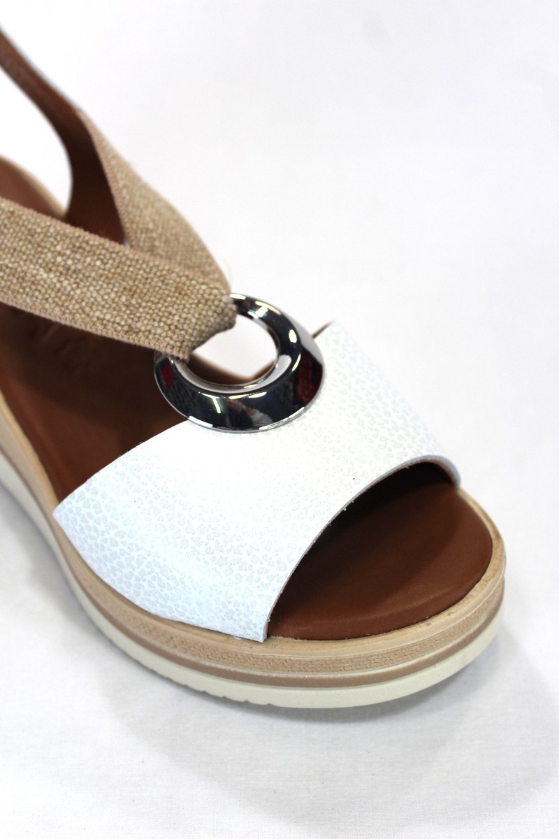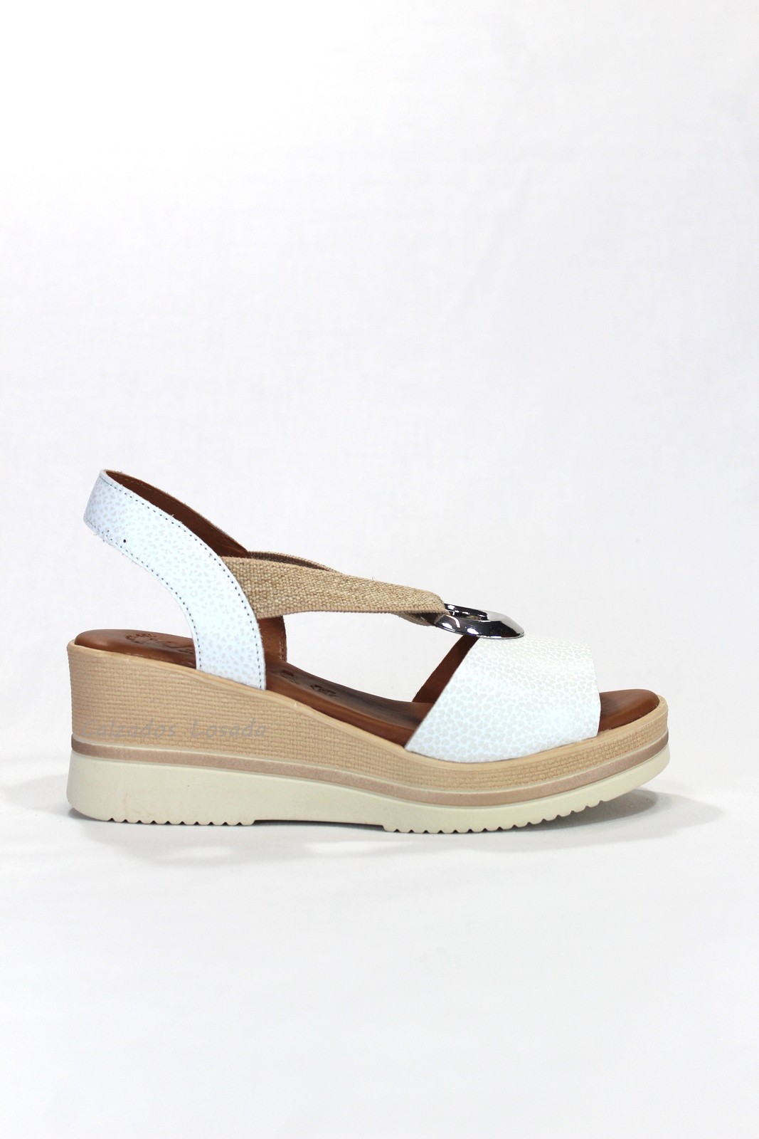 Sandalia de cuña media con tira lástica en empeine y adorno chapa dorada.