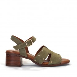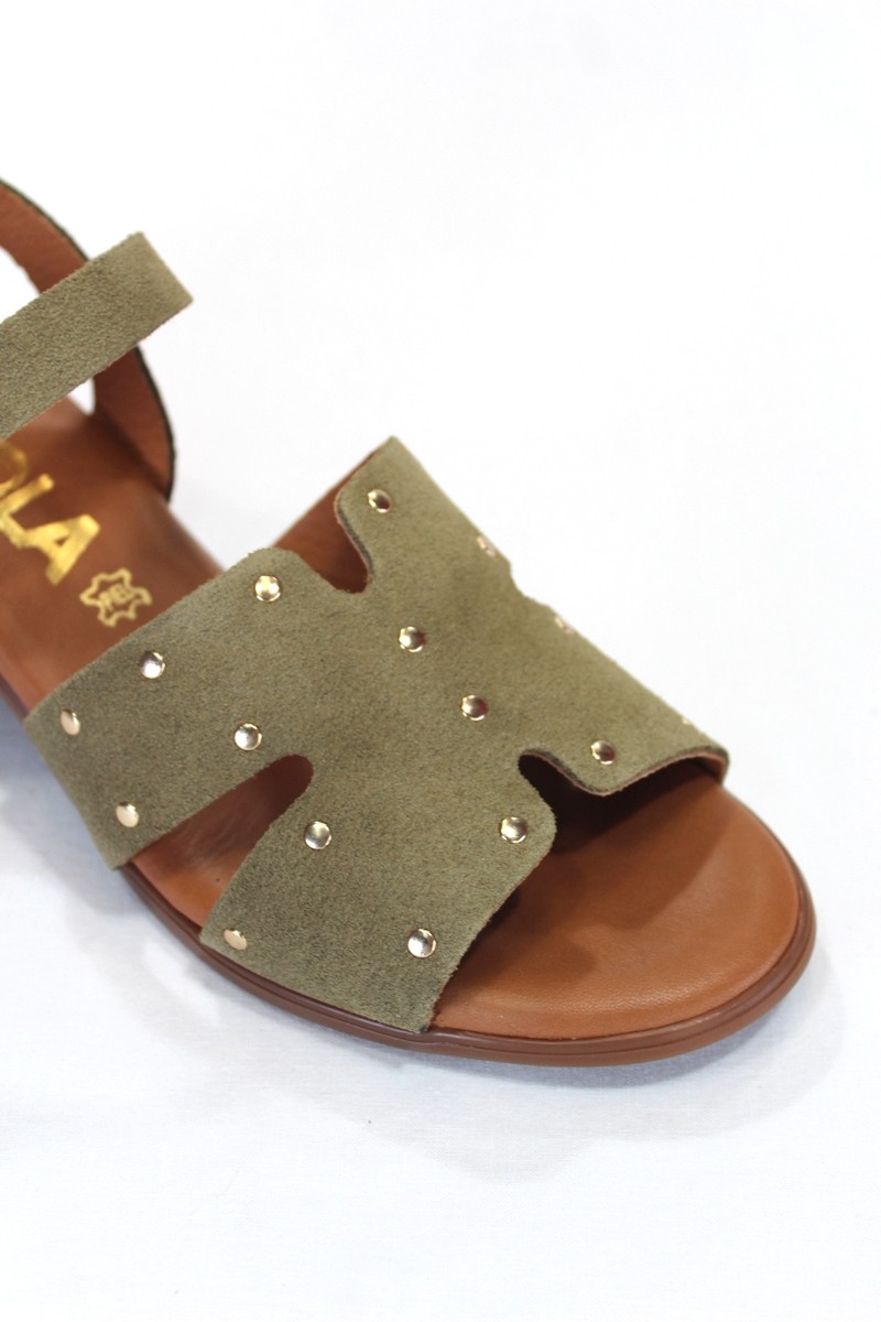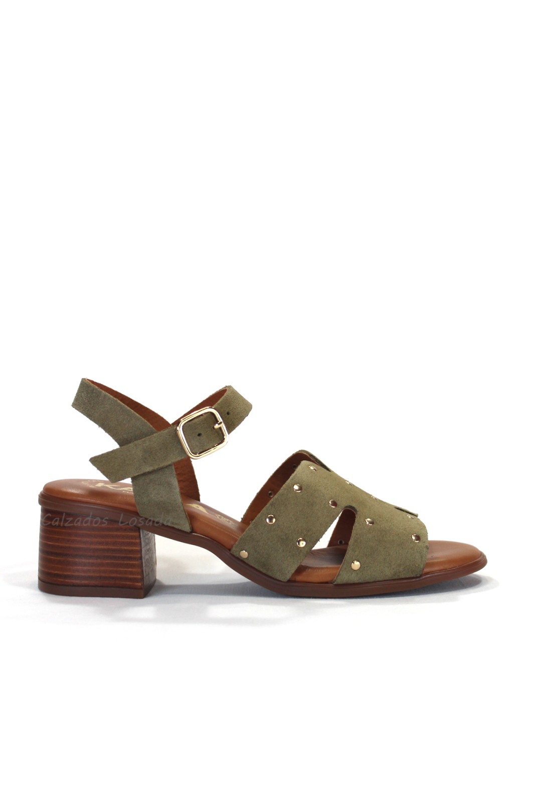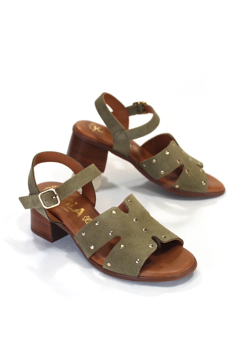 Sandalia tacón medio con detalle de tachuelas doradas.