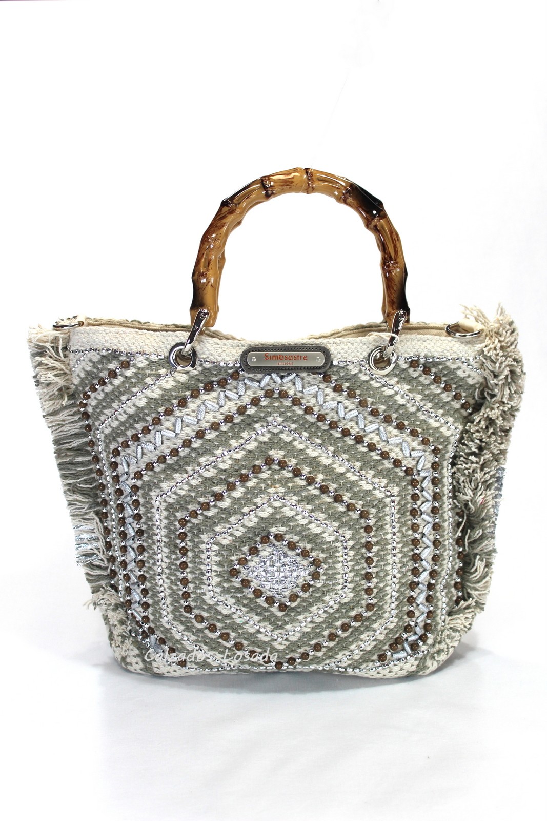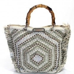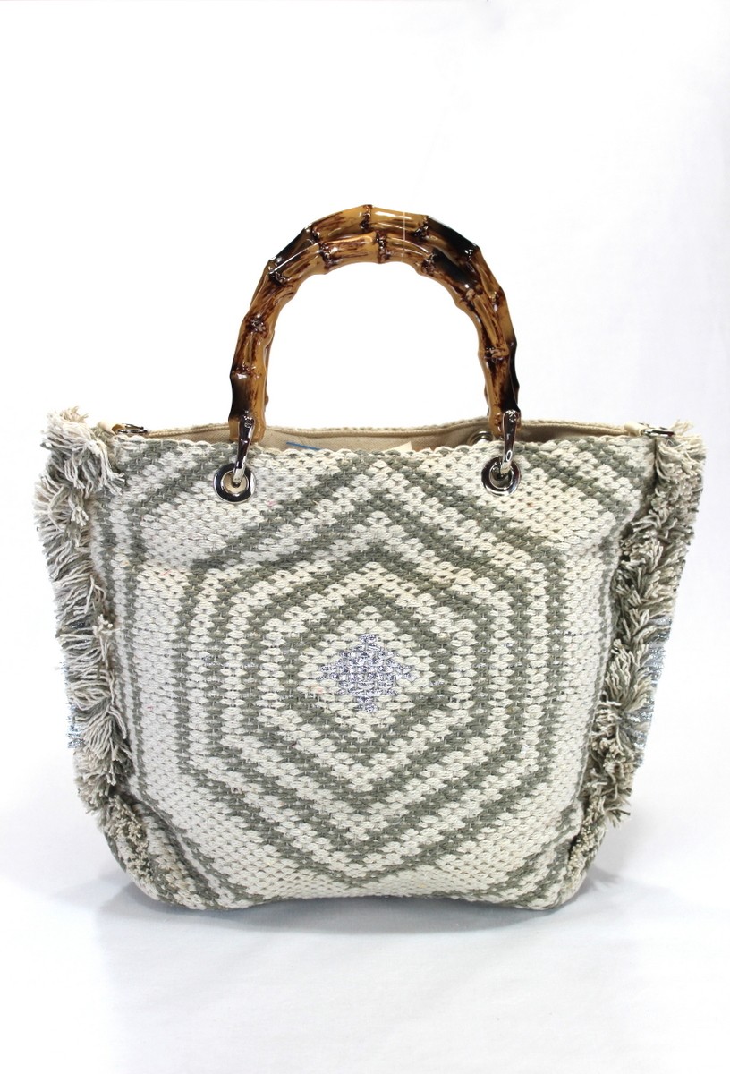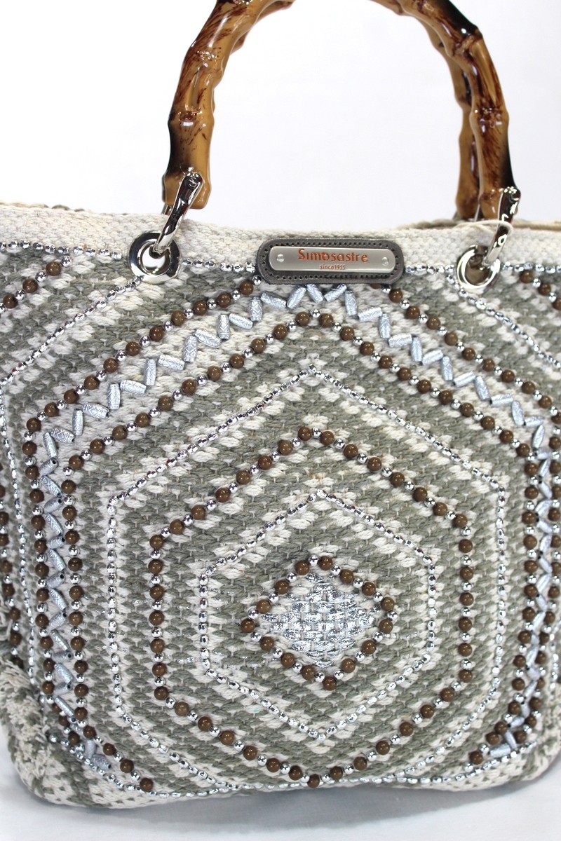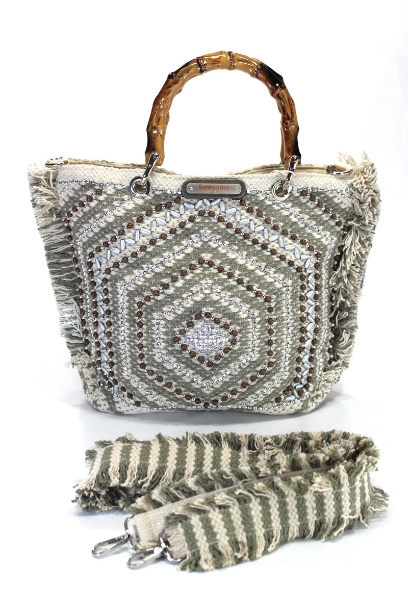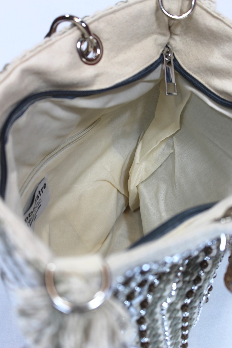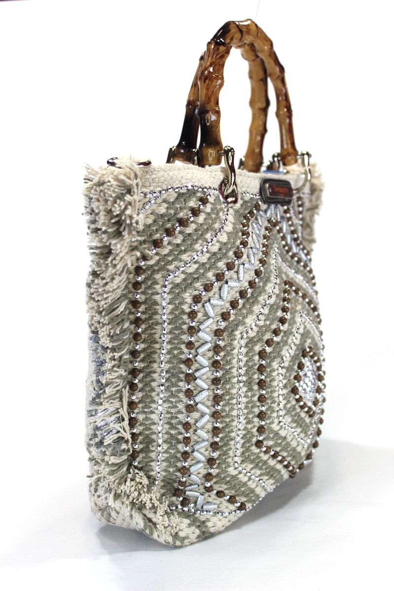 Bolso hecho a mano de forma artesanal de algodón con abalorios. Asas madera. Bandolera algodón.