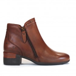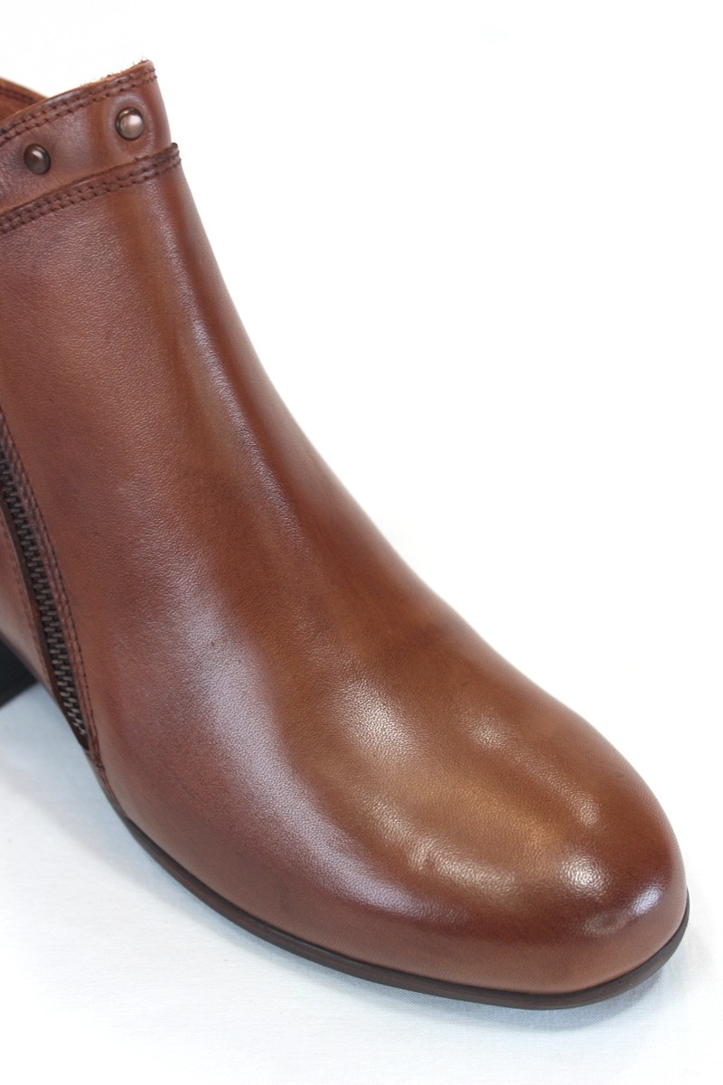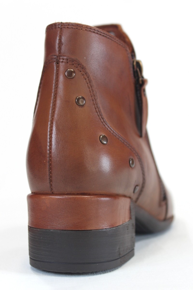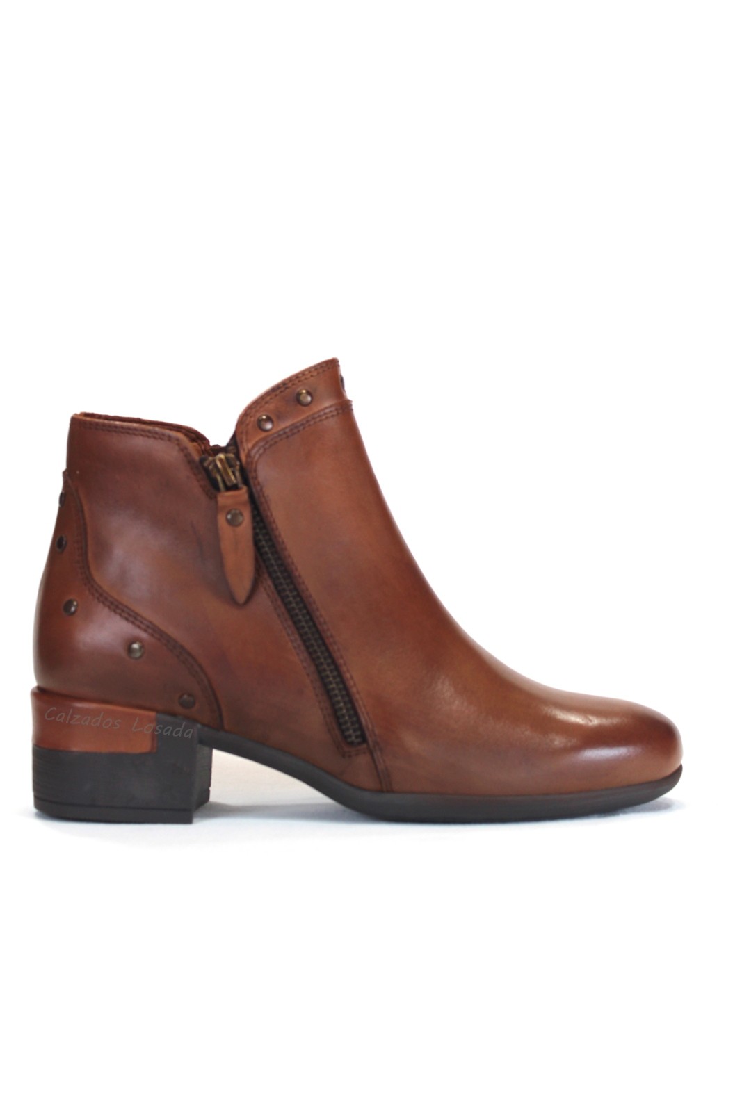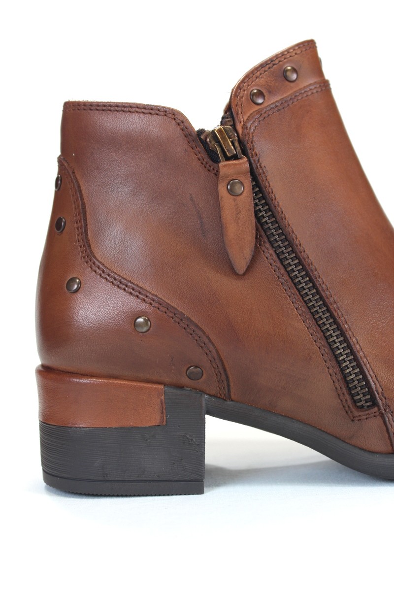Botín de mujer con detalle de tachuelas y cremallera decorativa.