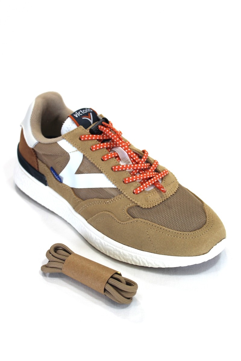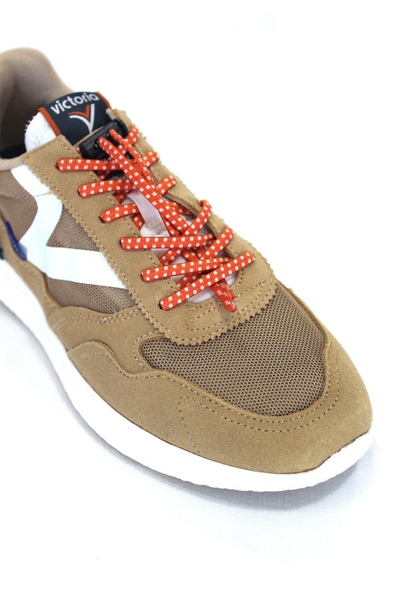 Cierre: Cordón beis taupe y cordón elástico naranjo y blanco.